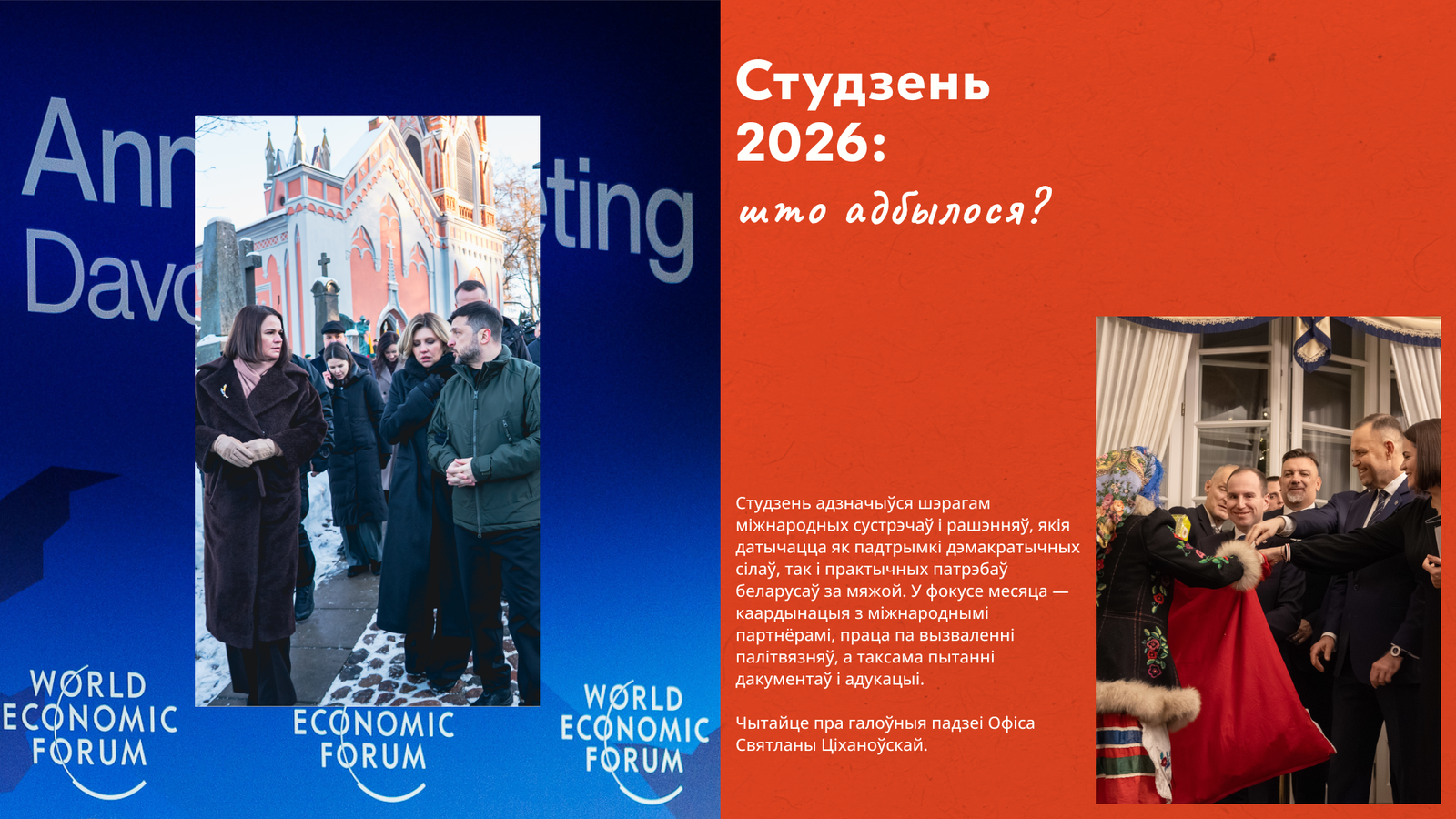 - Візіт у Давос. На палях Сусветнага эканамічнага форуму Святлана Ціханоўская правяла шэраг сустрэчаў з міжнароднымі лідарамі і ўплывовымі асобамі, а таксама ўдзельнічала ў дыскусіях на галоўных пляцоўках форуму.