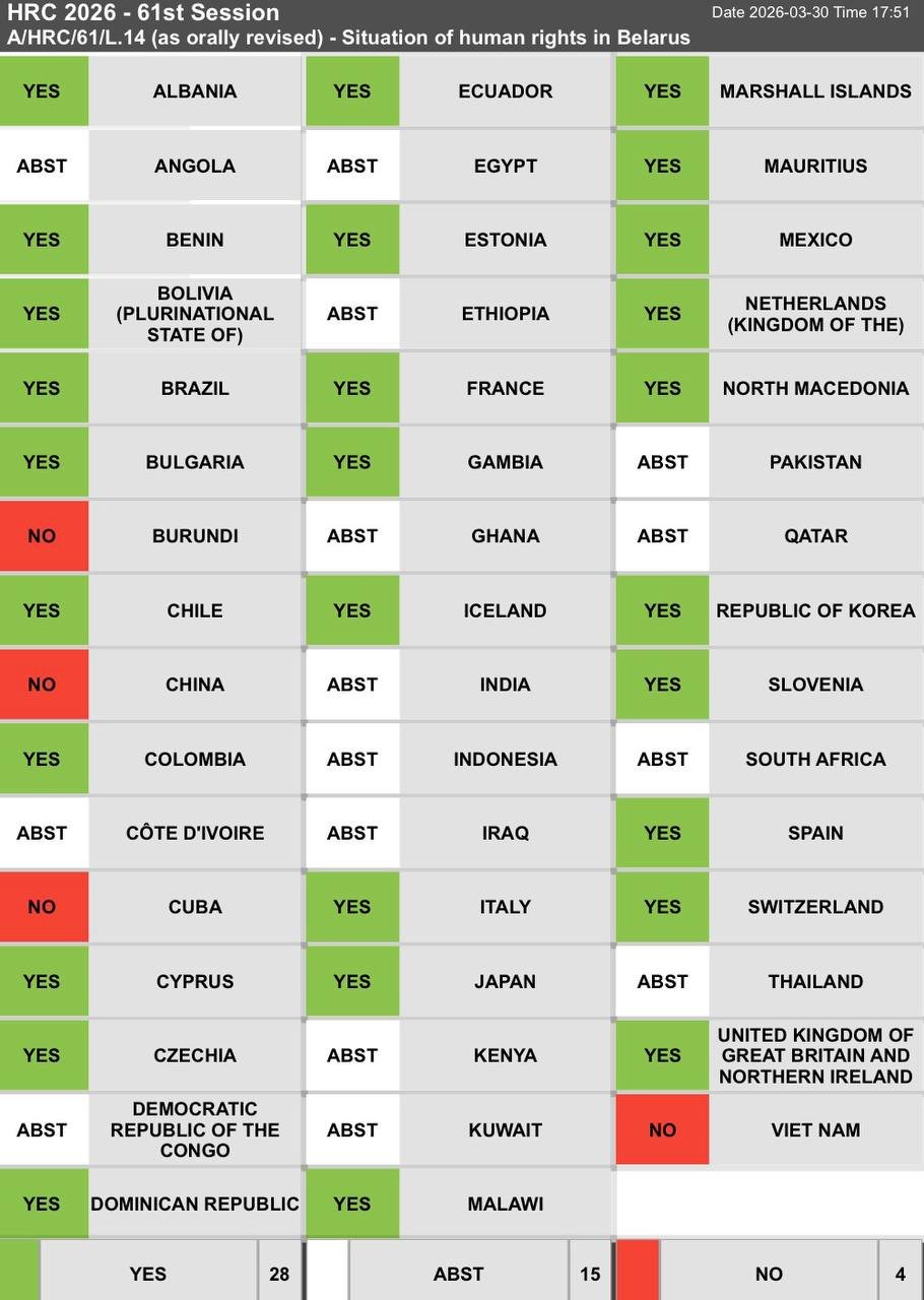We will continue our close cooperation with UN human rights mechanisms and thank the EU delegation for its initiative, as well as all 28 countries that supported the resolution. This is an important step in our shared effort to restore the rule of law in Belarus”.