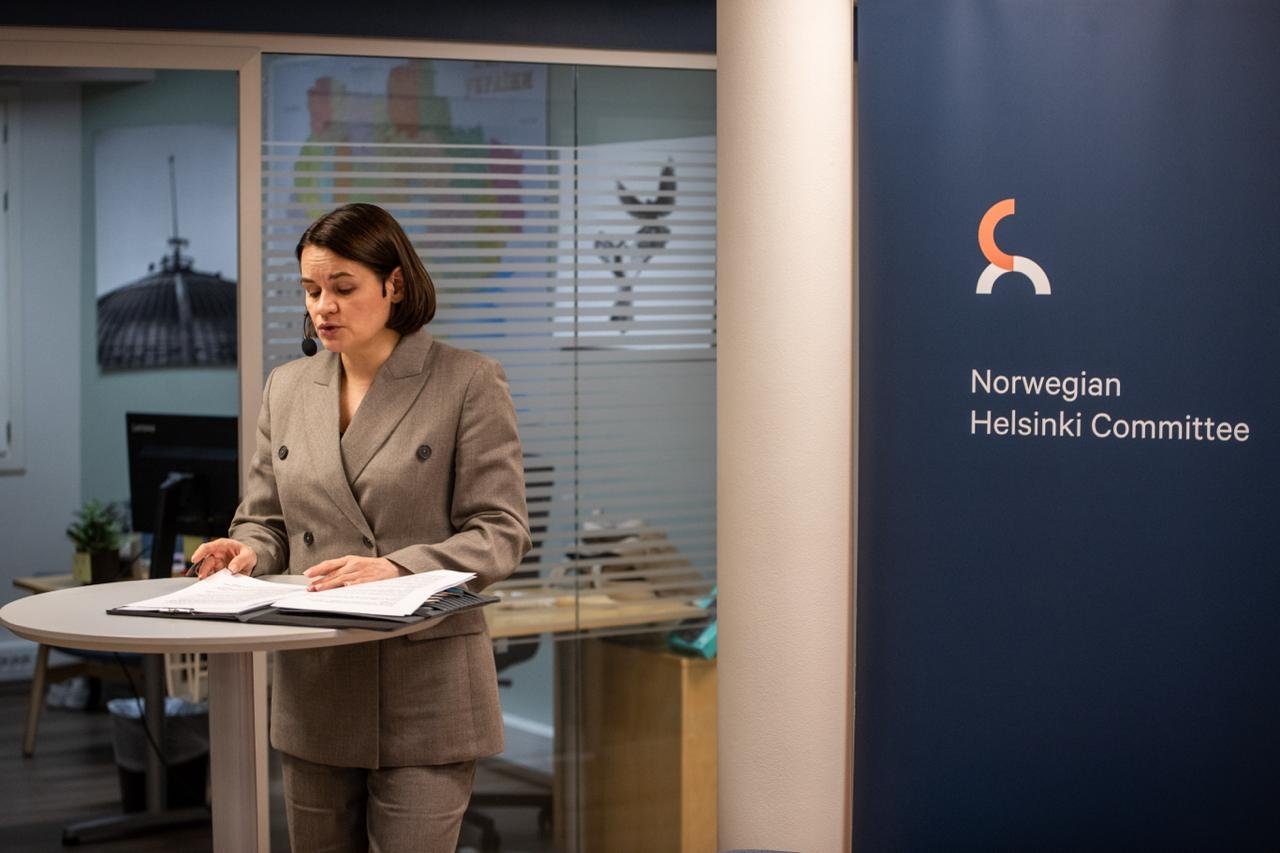Светлана Тихановская находится в Осло с рабочим визитом, где приняла участие в публичном мероприятии Норвежского хельсинкского комитета. Там беларусская лидерка выступила перед участниками с речью и рассказала о текущей ситуации: несмотря на работу по гуманитарному треку и освобождению, преследования по политическим мотивам в Беларуси продолжаются каждый день.